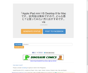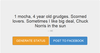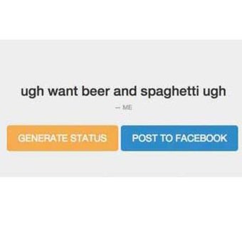 使い方はとてもシンプルサイトを開いて右上の青いボタンからFacebookのログイン情報を入力します。これで準備完了です。あとは画面中央の黄色いボタン「GENERATE STATUS」をクリックするだけ。あなたが言いそうな文章が表示されます。再度クリックすると別のバージョンを表示できますが、数には限りがあり10種類前後のフレーズが延々とループで表示されるようです。内容はランダムな組み合わせから構築されるので、アカウントによっては全然面白くない時もあります。
