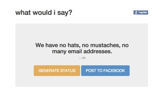 変なつぶやきをつくって遊べるWhat would i say?では、過去の投稿データを元に文章がランダムに作られ、「帽子も、髭も、Eメールアドレスもあんまり無い」などくすっと笑える物フレーズができたり、「時として大きな仕事に感謝する。太陽の中のチャックノリス」などと意味不明でありながらも不思議なインパクトを持つ詩のようなものを発見できたりと、意外と楽しめます。作成された内容を見て「あ~、確かに俺こんな事言いそうだわ~」と感じたらwhat would i say?サイトからワンクリックで直接Facebookへと投稿しましょう。投稿を見たFacebookの友達は、普段のあなたではなくアプリが作った発言だと気づくでしょうか?英語だけでなく日本語にも対応しているもありがたいですね。